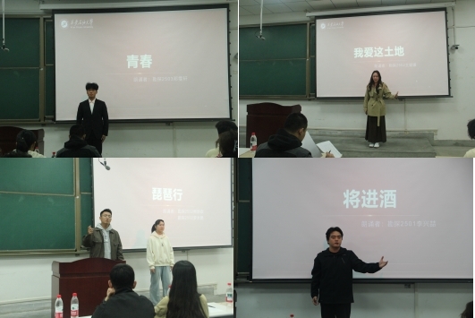 比赛在热烈氛围中拉开帷幕。围绕“典耀中华,赓续文脉”主题,参赛选手依次登台,以饱满的热情和多样的形式演绎经典作品。有的深情婉转,如溪流潺潺;有的激昂澎湃,似烈火炽燃。《将进酒》的豪迈、《青春》的激扬、《琵琶行》的婉转、《中国文脉》的厚重……选手们用声音勾勒诗意画卷,用情感传递文化力量,赢得了现场观众的阵阵掌声。经过激烈角逐,勘探2503邓雯轩《青春》 与勘探2501李兴喆《将进酒》 斩获一等奖,并将代表学院参加校级“秋之韵”诗文配乐朗诵比赛。