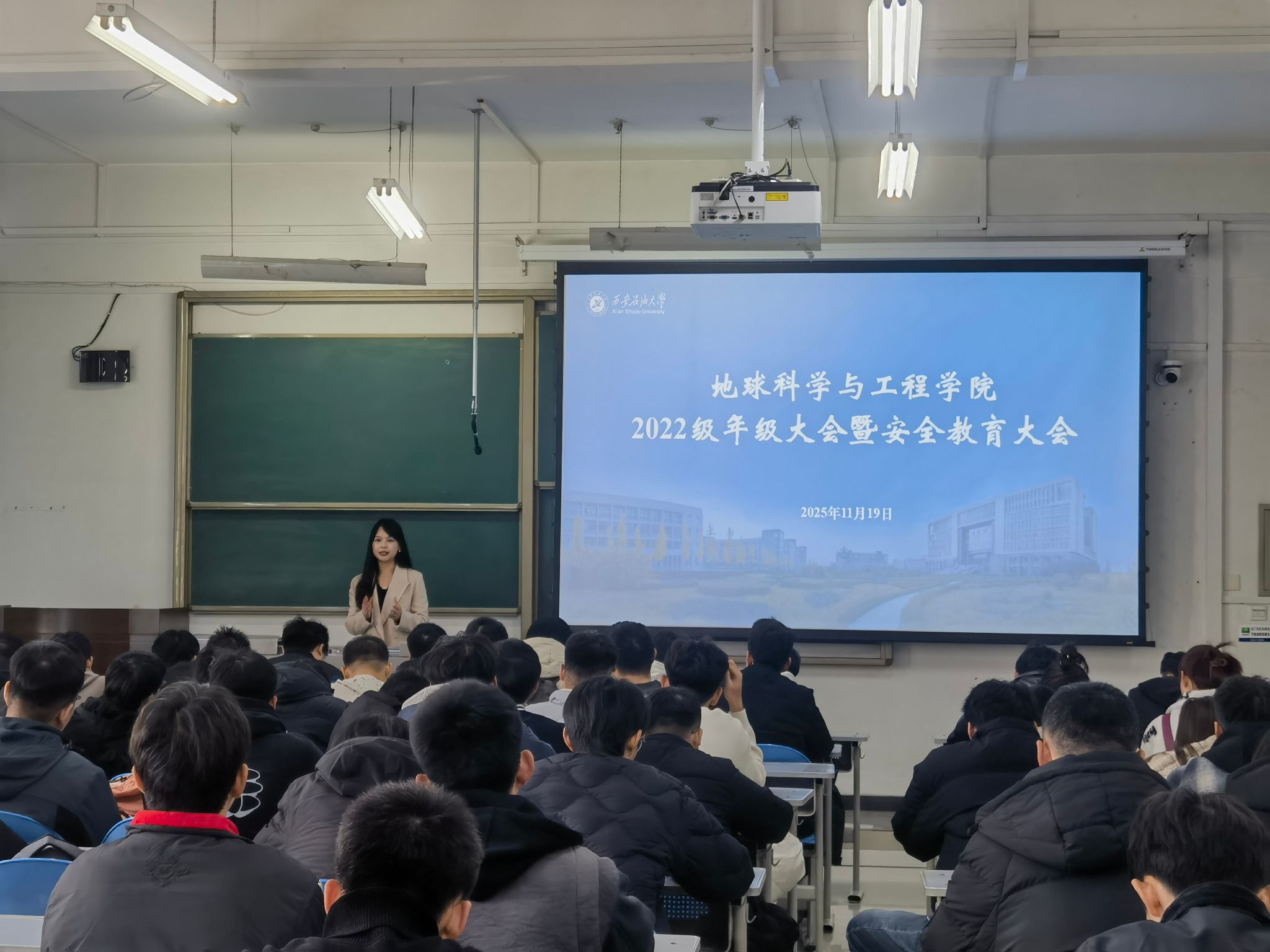 在鄠邑校区博览楼A308教室召开2022级年级大会暨安全教育大会。学院学工办主任、2022级辅导员姜楠主讲,2022级本科生参加。